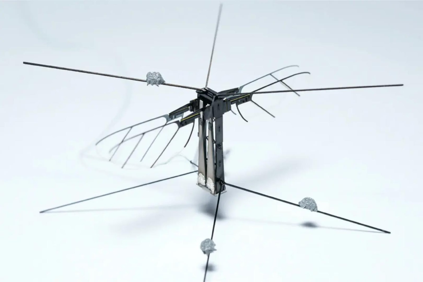 Przednie skrzydła są nachylone w jednym kierunku względem korpusu robota, podczas gdy tylne skrzydła są nachylone w przeciwnym kierunku. Taka konstrukcja niweluje moment obrotowy netto, gdy wszystkie cztery skrzydła machają z tą samą prędkością, ale generuje moment obrotowy odchylenia, gdy prędkość machania każdego skrzydła jest zmieniana niezależnie. Oczywiście sam robot nie jest specjalnie wielki. Waży ledwie 95 miligramów, a jego rozpiętość skrzydeł mierzy jedyne 33 mm. To więc mikrus, który na dodatek jest zasilany zewnętrznie i może latać do 10 minut.