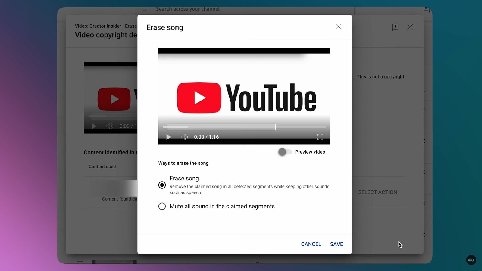 Funkcja usuwania utworu była wcześniej dostępna w wersji beta umożliwiającej wyciszenie muzyki chronionej prawem autorskim w filmach YouTube. Firma odkryła jednak, że działanie narzędzia nie jest wygodnym rozwiązaniem. Dlatego YouTube wprowadza w tym roku duże ulepszenia, dodając algorytm oparty na sztucznej inteligencji, który pozwala dokładniej identyfikować i usuwać treści chronione prawem autorskim w łatwy sposób.