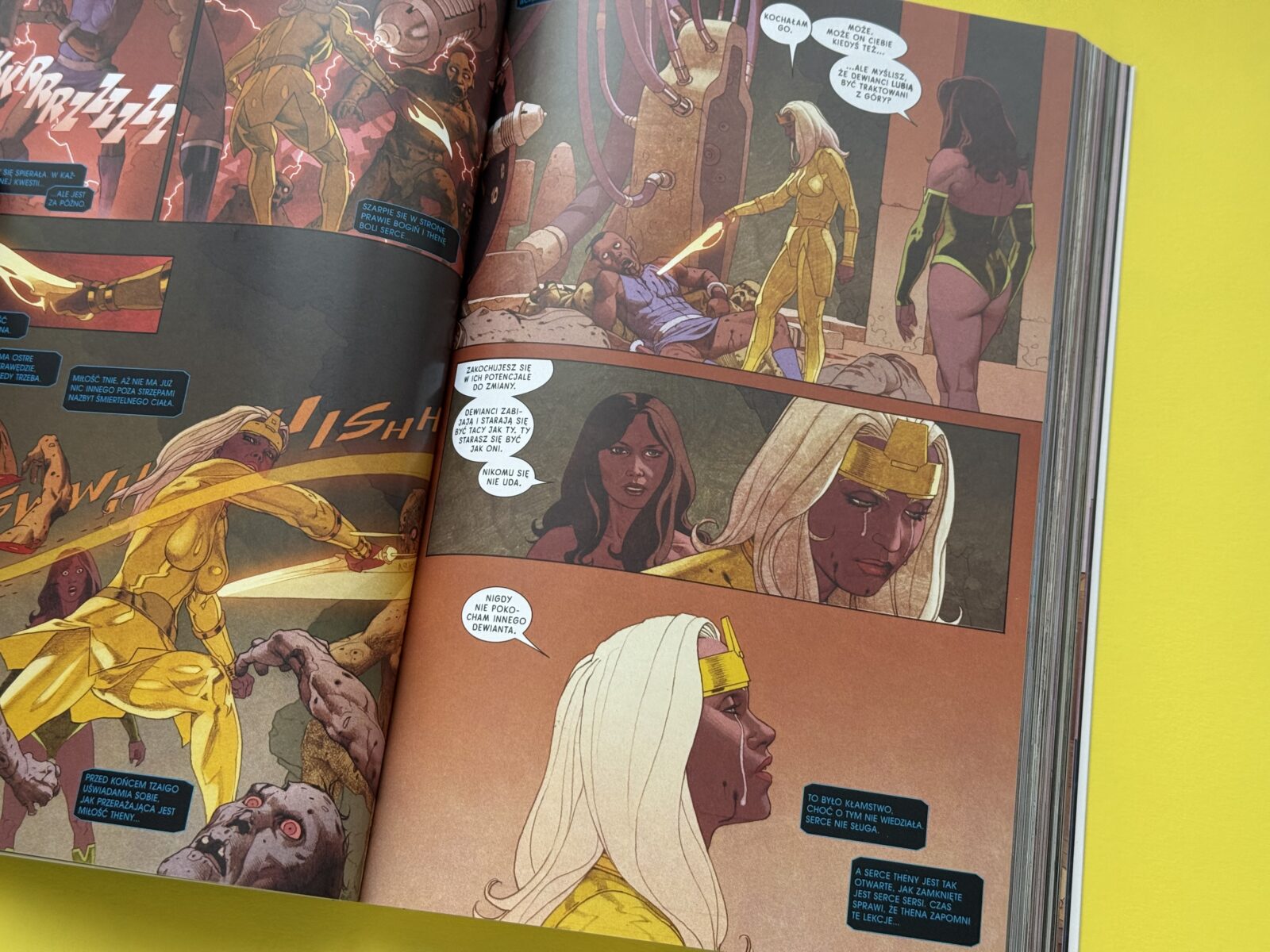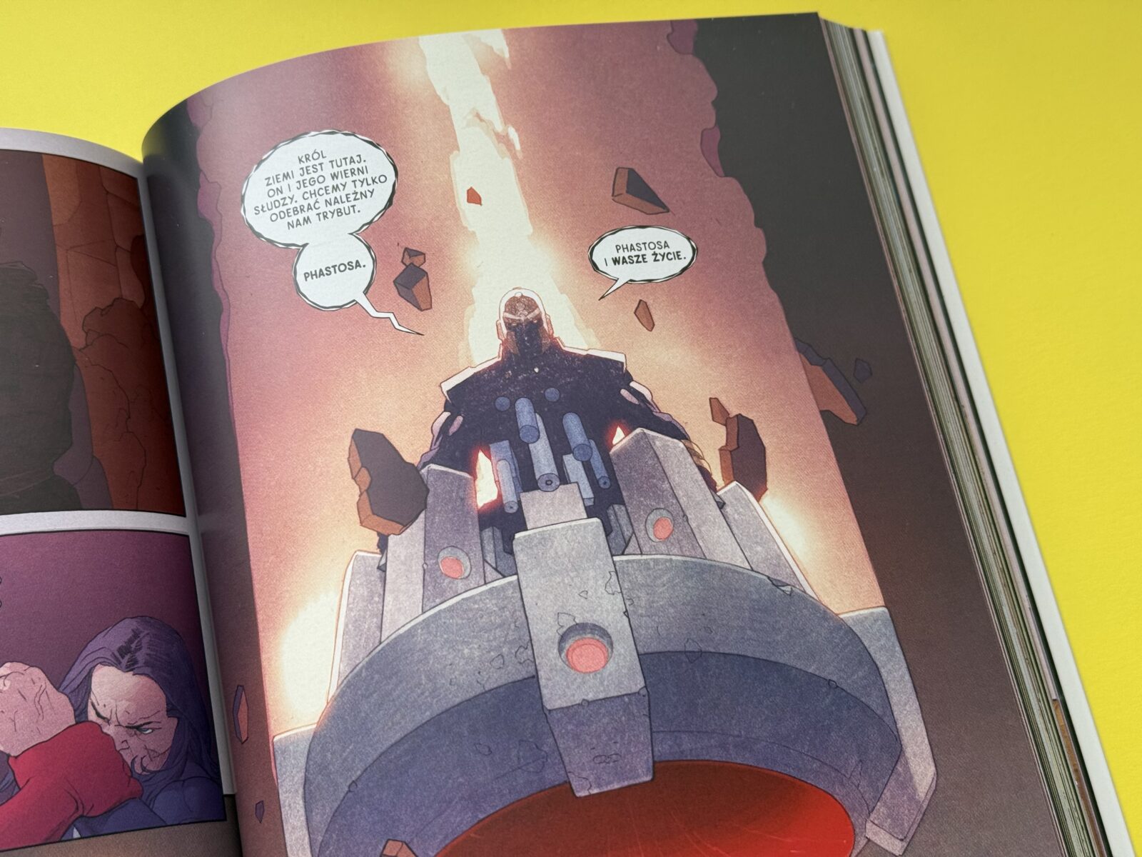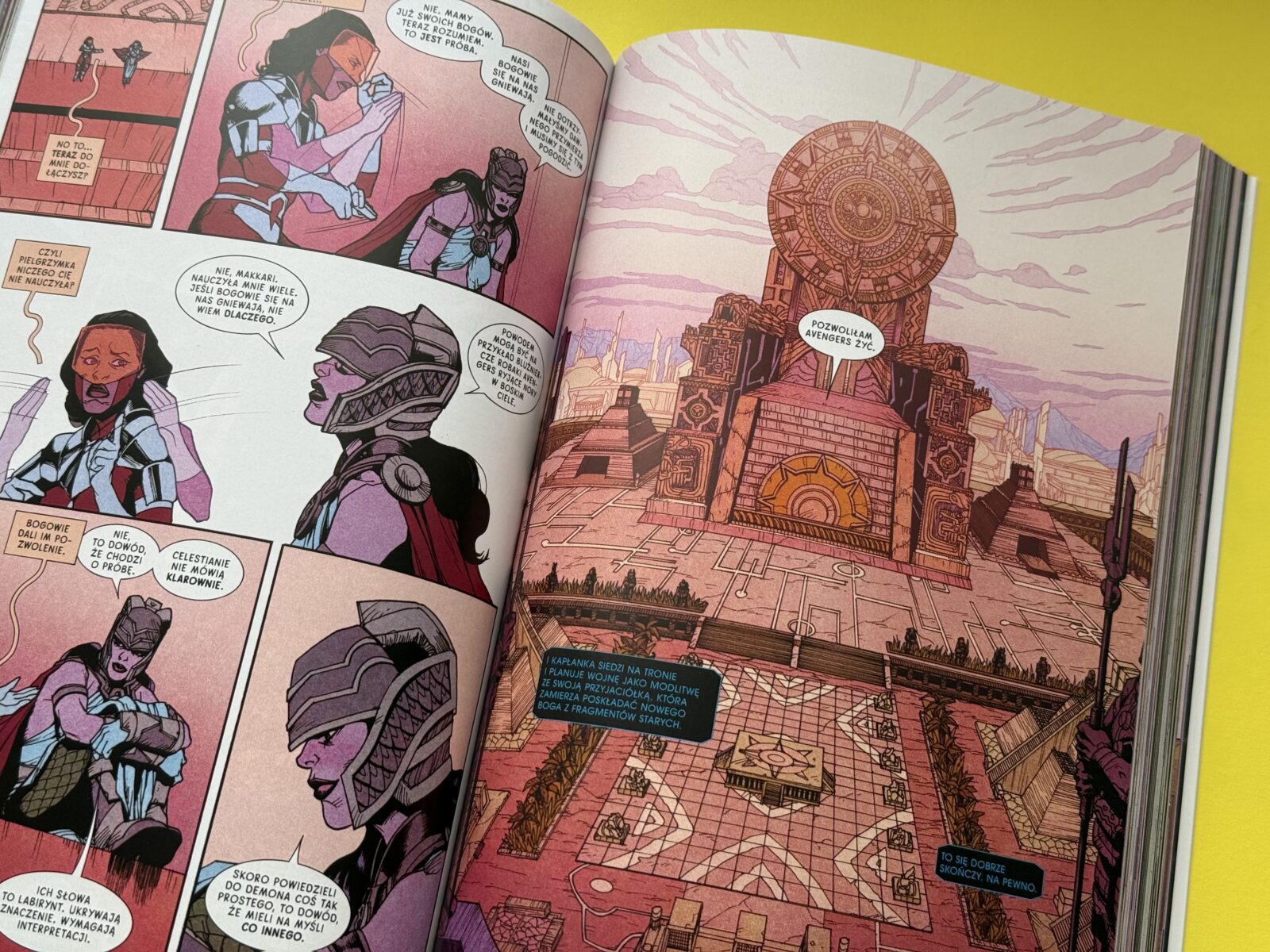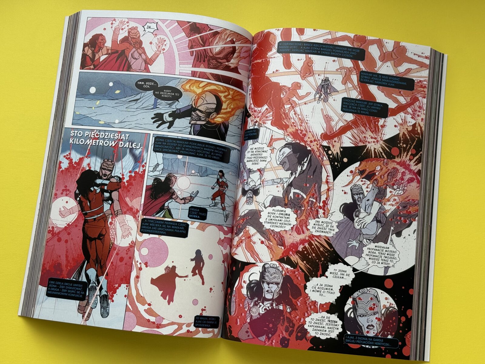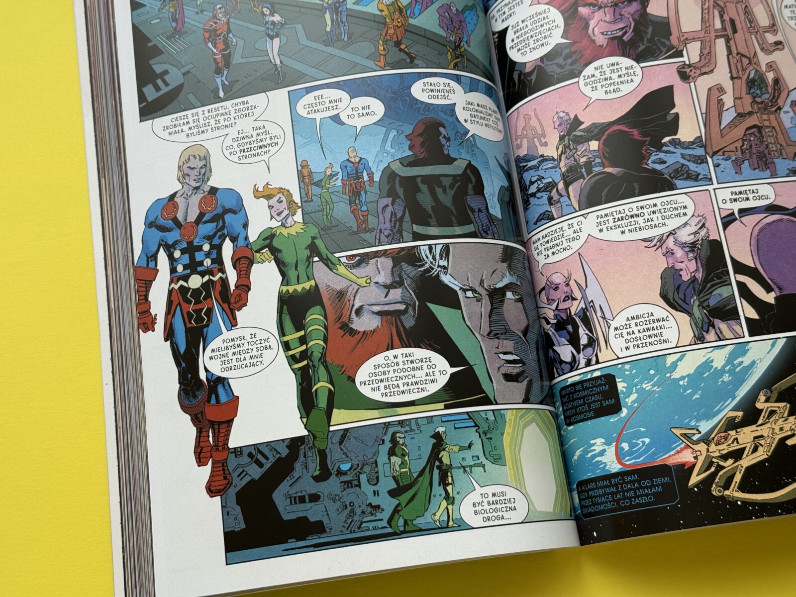 Guiu Vilanova, który wspiera Ribića, wnosi z kolei precyzję i dyscyplinę narracyjną, przez co całość zyskuje klarowność. To dzięki niemu sceny bardziej przyziemne – rozmowy, konflikty wśród bohaterów – nie toną w patosie, lecz nabierają dramatycznej lekkości. Kolory podkreślają nastrój – raz pełne złocistego blasku, jakbyśmy patrzyli na antyczne malowidło, innym razem przygaszone i chłodne, jak w thrillerze science fiction. Efekt jest taki, że wizualnie “Przedwieczni” nie przypominają typowego komiksu Marvela – bliżej im do malarskich wizji Moebiusa czy ilustracji fantasy z lat 80. ubiegłego wieku.