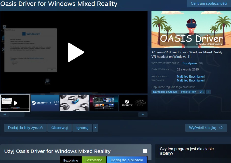 Na szczęście z pomocą przyszedł Matthieu Bucchianeri, główny menedżer inżynierii oprogramowania układowego w Microsofcie. Stworzył on darmowy sterownik Oasis, który nie tylko przywraca funkcjonalność porzuconym goglom, ale wręcz poszerza ich możliwości. Sterownik oferuje pełne śledzenie gogli i kontrolerów ruchu oraz natywny potok renderowania SteamVR. Dzięki temu gogle zyskują kompatybilność z SteamVR, OpenVR i OpenXR, co otwiera dostęp do ogromnej biblioteki gier i aplikacji VR. Nazwa nie jest przypadkowa, ponieważ Microsoft wewnętrznie używał kryptonimu „Oasis” dla swoich działań związanych z Windows Mixed Reality.