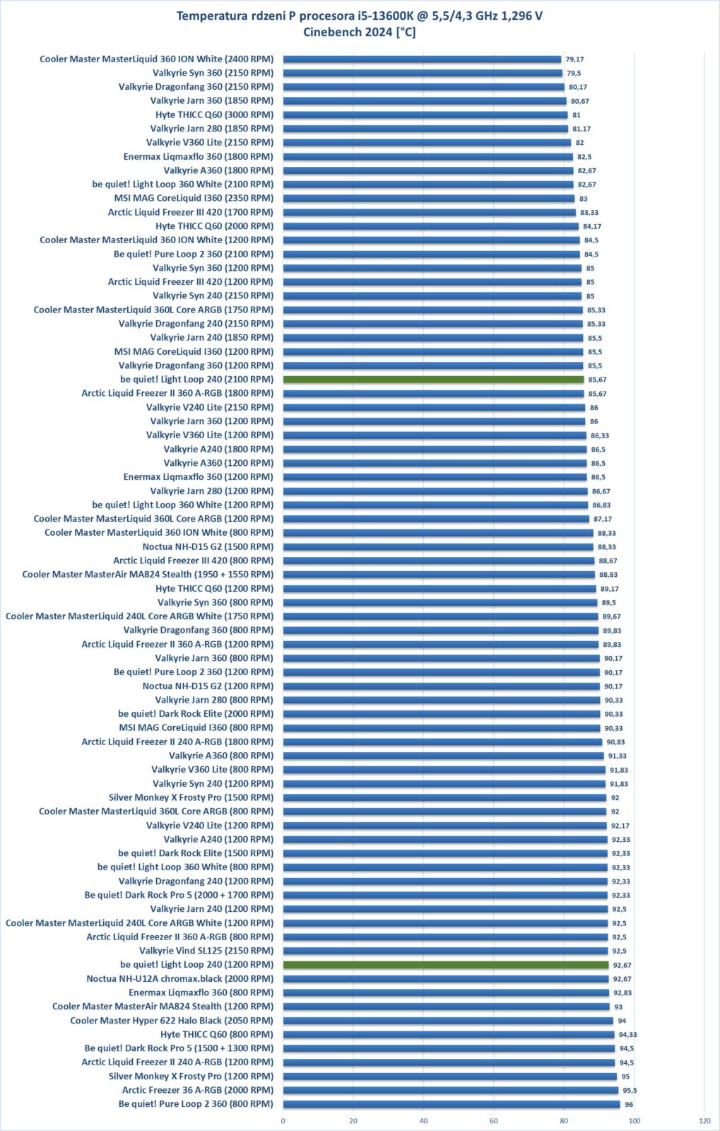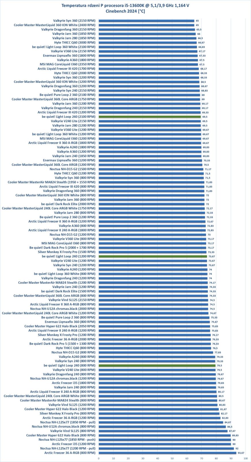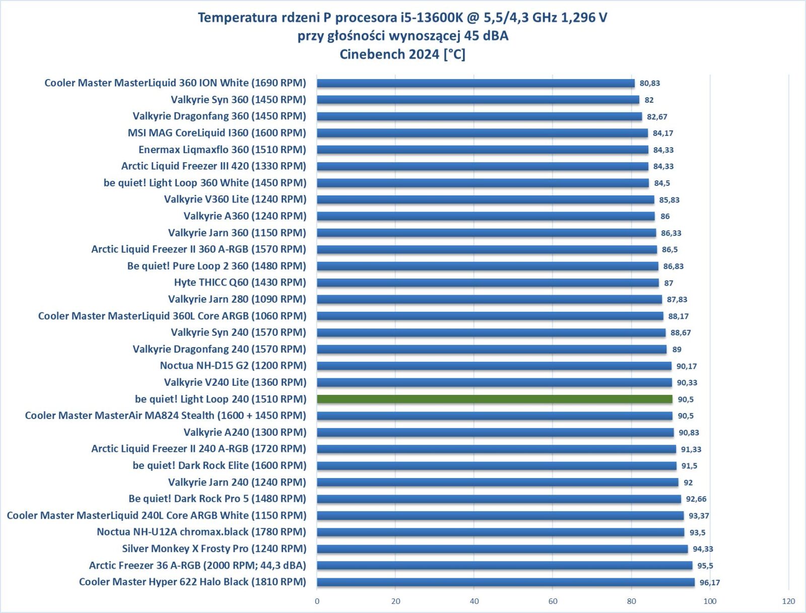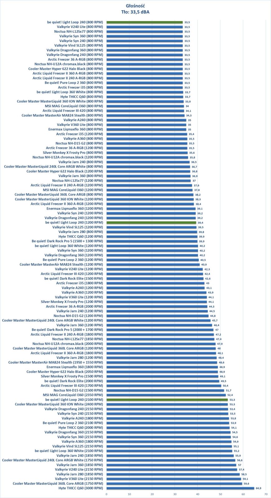 Wydajność jest całkiem niezłe jak na AiO 240. Na wszystkich obrotach mamy wynik podobny do Valkyrie V240 Lite, co jest naprawdę dobrym rezultatem.