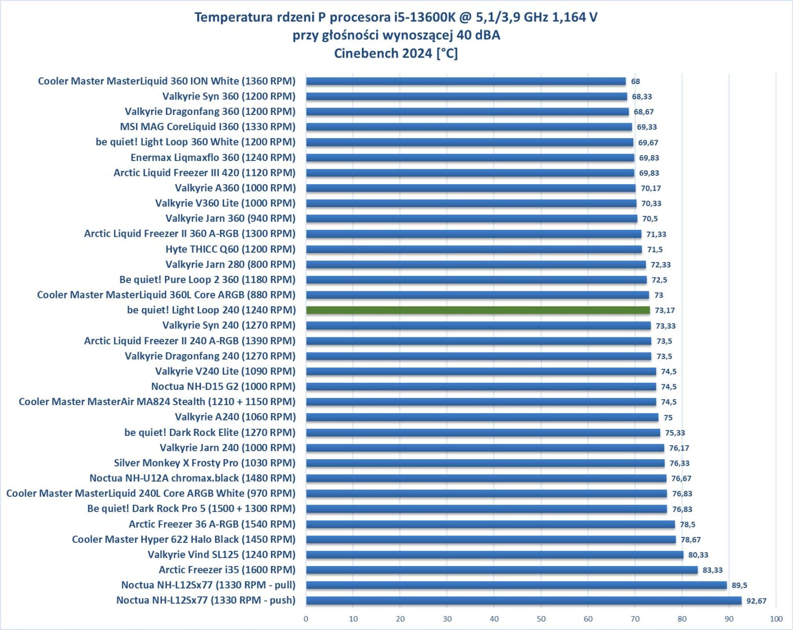 W przypadku normalizacji do 40 dBA jest zaskoczenie i chłodzenie notuje najlepszy wynik spośród AiO 240 – minimalnie przed Valkyrie Syn 240.
