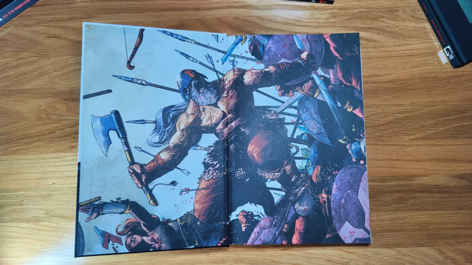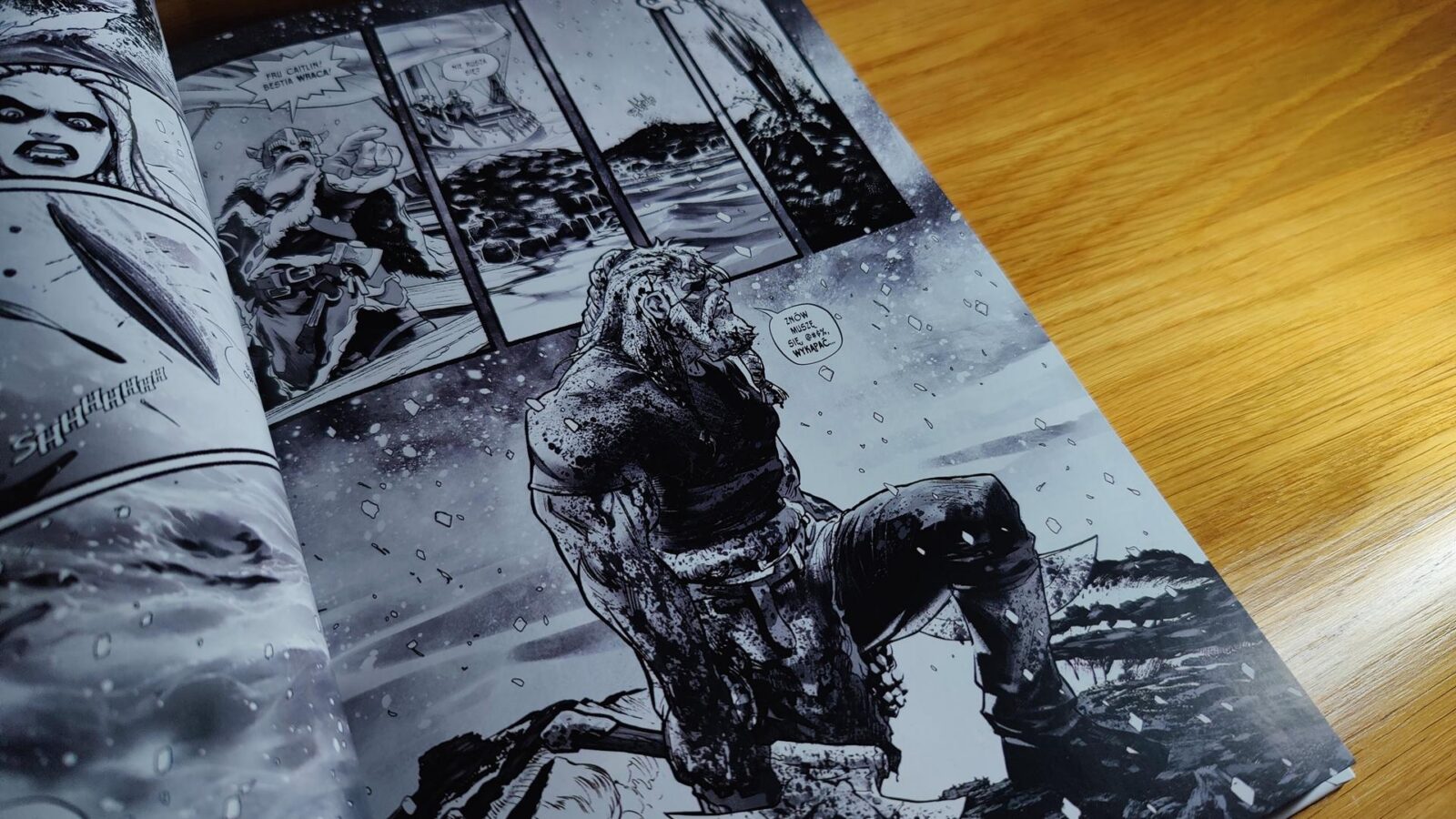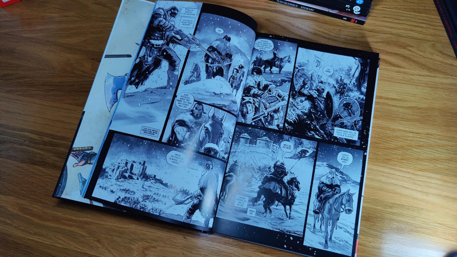 Pierwsza połowa Mroczni Rycerze ze Stali. Wszechzima jest idealna. Autorzy nie próbują przekonać nas, że ta historia jest jakimś arcydziełem i nie przedstawiają jej tak, jakby była wstępem do czegoś wielkiego. Ot jedna wielka rąbanina, ale z jasnym wrogiem, konkretnym celem i doskonale znanymi nam rozterkami z opowieści o bohaterach mających swoje mroczne strony. Fenomenalnie sprawdza się też zabieg z kolorami, a jedna scena jest wręcz ucztą dla oczu. Historia ma fajne domknięcie, można się wzruszyć i… niestety po przewróceniu kartki, trafiamy nie na galerię alternatywnych grafik, a kolejną, odrębną opowieść w zupełnie innej szacie graficznej, która osobiście kompletnie mnie nie kupuje.