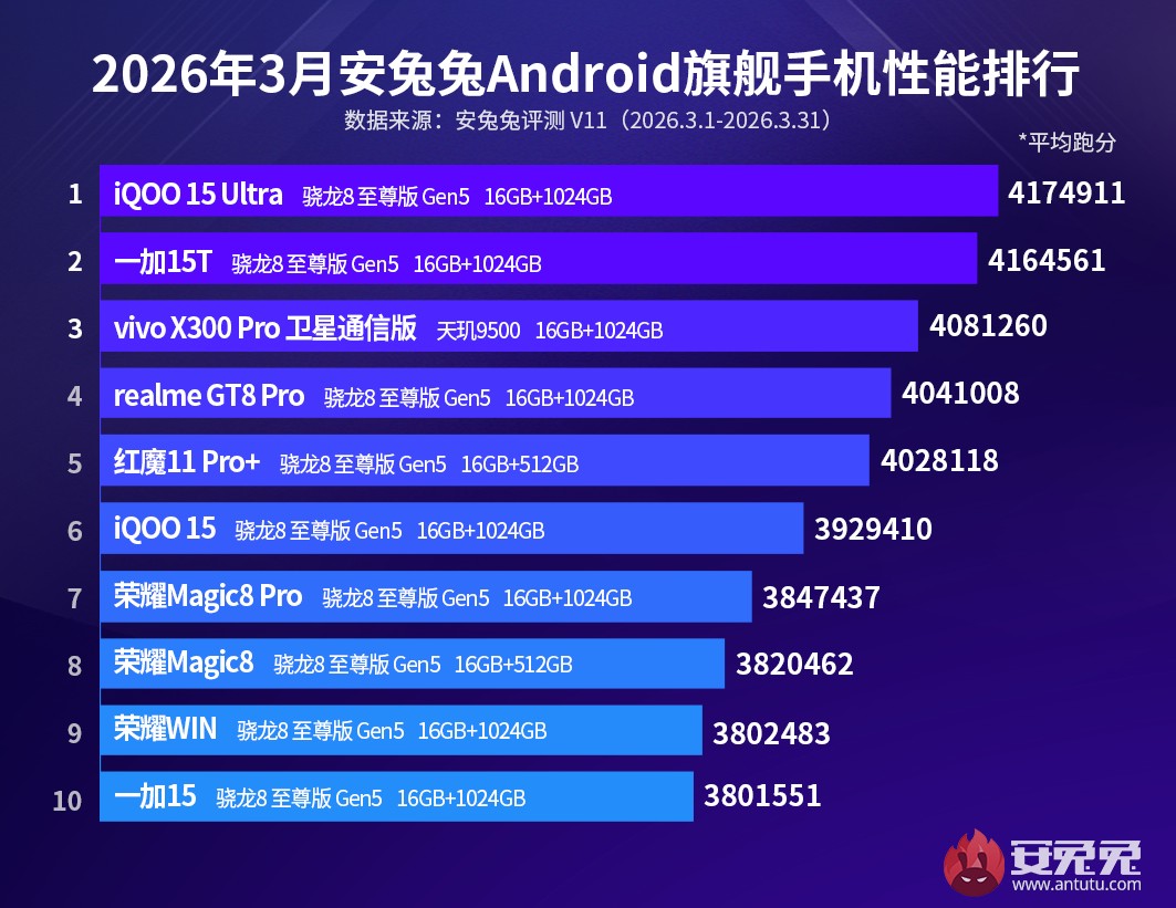- iQOO 15 Ultra (4,17 mln pkt) – lider zestawienia, który utrzymał swoją pozycję z lutego, ale z jeszcze lepszym wynikiem. To zasługa unikalnego, aktywnego systemu chłodzenia z wbudowanym wentylatorem, który pozwala procesorowi pracować na najwyższych obrotach bez przegrzewania się.